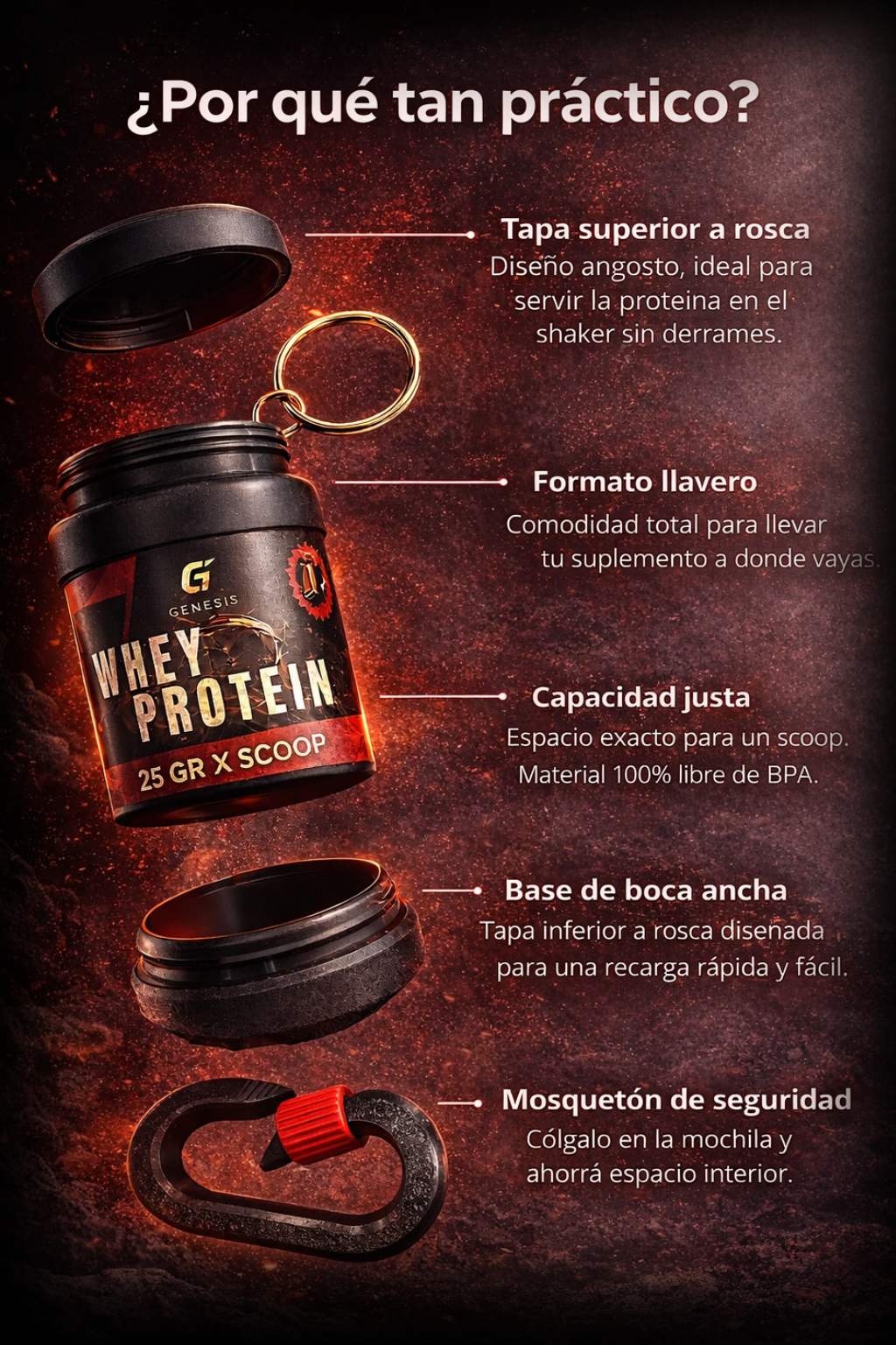 El Porta Proteína Genesis está diseñado para transportar la cantidad justa de suplemento de forma práctica, segura y compacta.